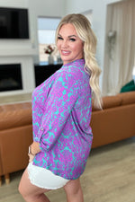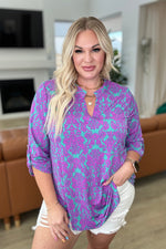 Transform your closet with the Lizzy Top in Teal and Magenta Damask. Made from Bulgari, this top features a gabby neckline and button rolled sleeve tabs for a comfortable, yet eye-turning piece. The 3/4 sleeve and scoop hem add flow to the already stylish piece. Experience comfort and style in one with the Lizzy Top.